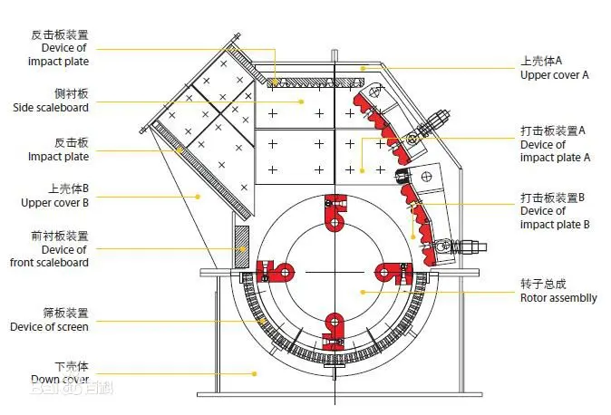 Strukturnya mudah dan terdiri daripada selongsong, pemutar dan plat impak. Bahagian kerja utama penghancur impak adalah pemutar berputar berkelajuan tinggi dengan tukul plat. Semasa proses impak reciprocating, blok bahan juga bertembung antara satu sama lain. Oleh kerana bahan itu dipukul oleh tukul plat, kesan plat impak dan perlanggaran antara satu sama lain, retak dan melonggarkan sentiasa dihasilkan di dalam, yang akhirnya membawa kepada penghancuran. Peranti impak digunakan untuk menahan bahan yang dilanda tukul plat dan melantun semula. Komponen utama adalah plat impak, yang dikimpal dengan plat keluli. Terdapat lapisan tahan haus pada permukaan kesannya, dan beberapa menggunakan bar kesan atau plat grating.
